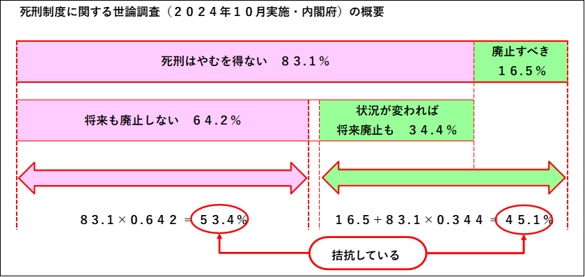 政府は、死刑制度を存置すべき根拠の一つとして国内世論を位置づけている。また、内閣府が2024年10月に実施した世論調査(以下「2024年調査」という。)では、「死刑はやむを得ない」とする回答率が83.1%であり、前回の2019年調査における80.8%から微増している。